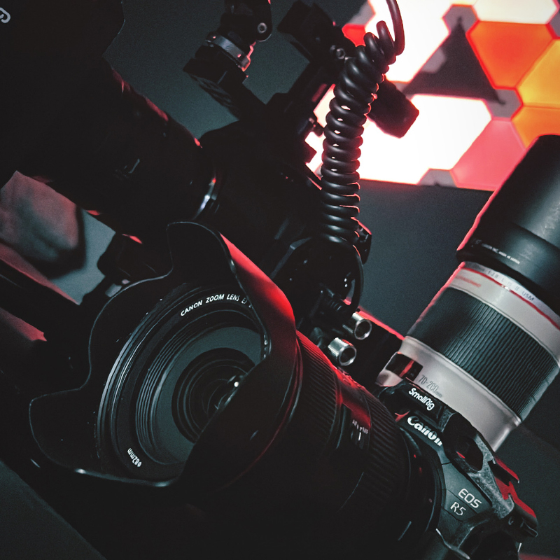 Pentru proiecte personale folosim Blackmagic 6K Pro (6K 50fps / 12 bit RAW) si Canon R5 (8K 30fps / 12 bit RAW / 120fps 4K). Pentru productii comerciale si un buget mai mare, vom folosi RED sau Arri. In materie de obiective, lumini, echipamente audio, detinem toata gama ce poate fi folosita in productie. Pentru filmari aeriale, licenta de zbor internationala este utilizata pe DJI Mavic 2 Pro si DJI Inspire 2.